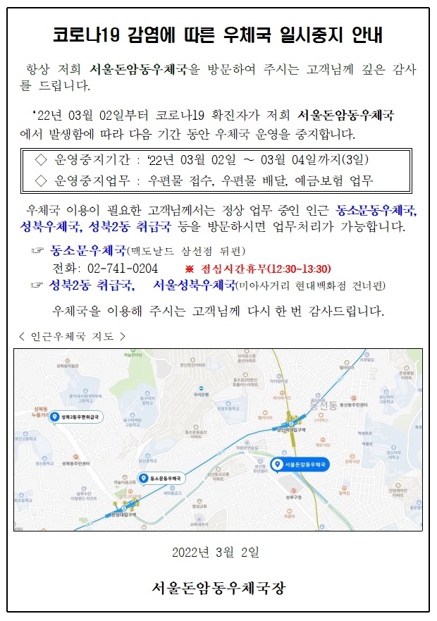 코로나 19 확진자 발생에 따른 서울돈암동우체국 일시중지 안내