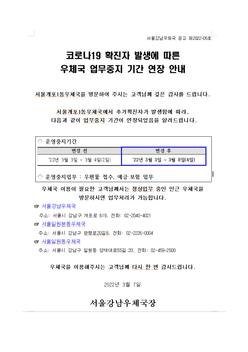 서울개포1동우체국 업무중지기간 연장 안내