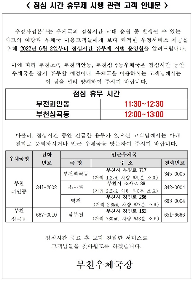 부천 관내우체국(괴안동, 심곡동) 점심시간 휴무제 안내