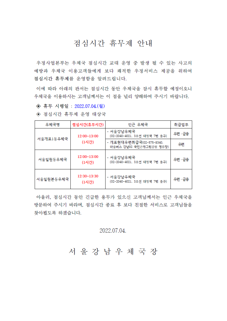 서울개포1동, 일원동, 일원본동 우체국 점심시간 휴무제 실시 안내