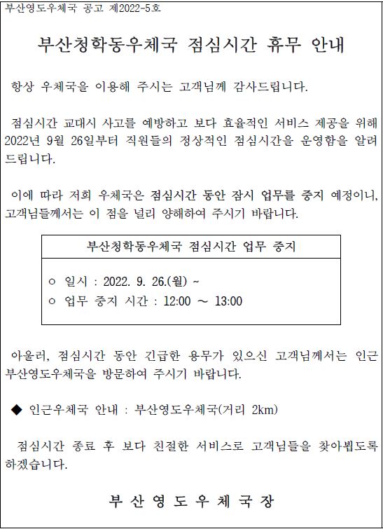 부산청학동우체국 점심시간 휴무 안내