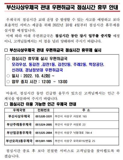 부산사상우체국 소속 우편취급국 점심시간 휴무 안내