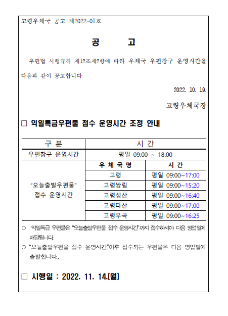 고령우체국 소속국 국내특급우편물 접수 운영 시간 조정 공고