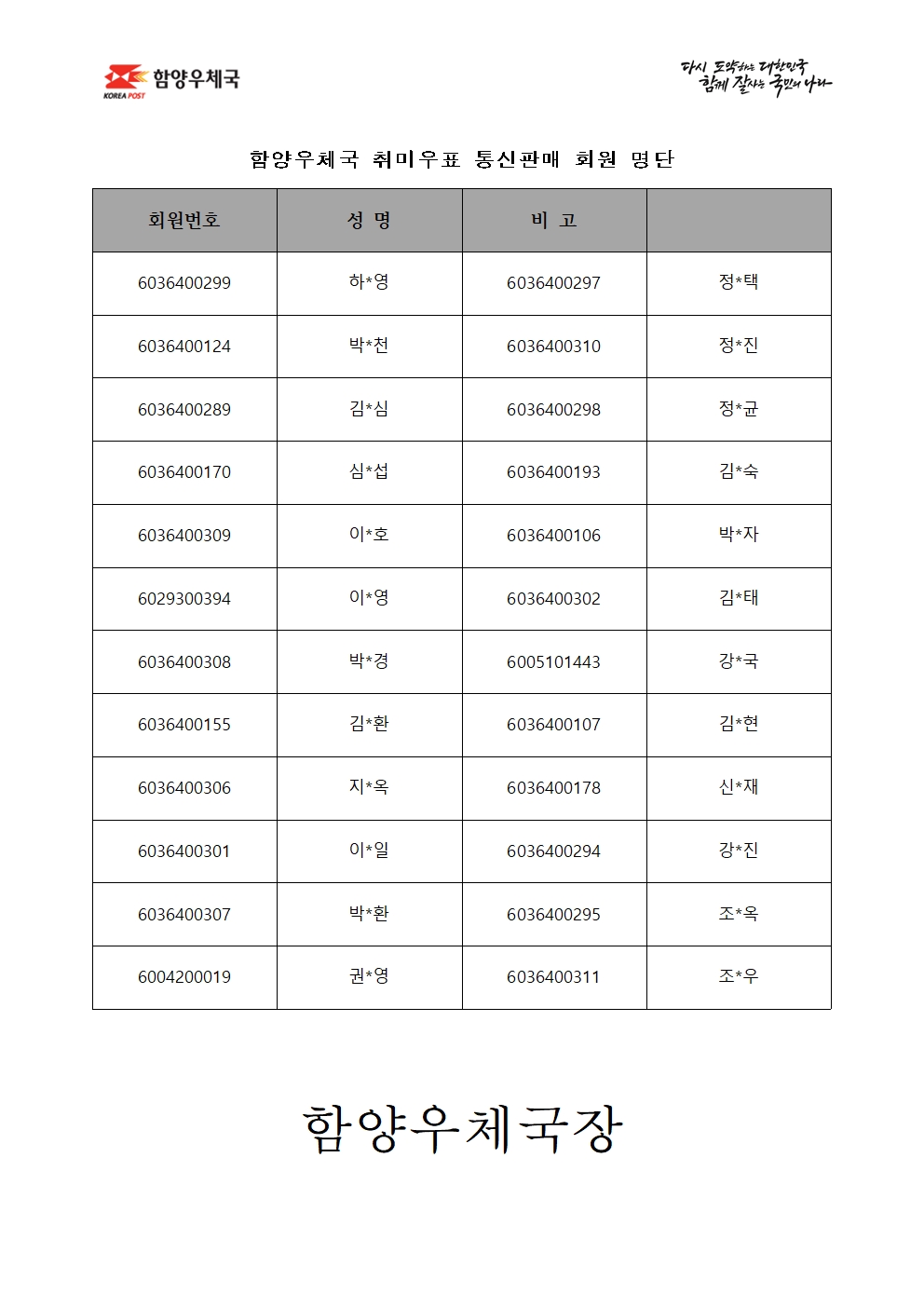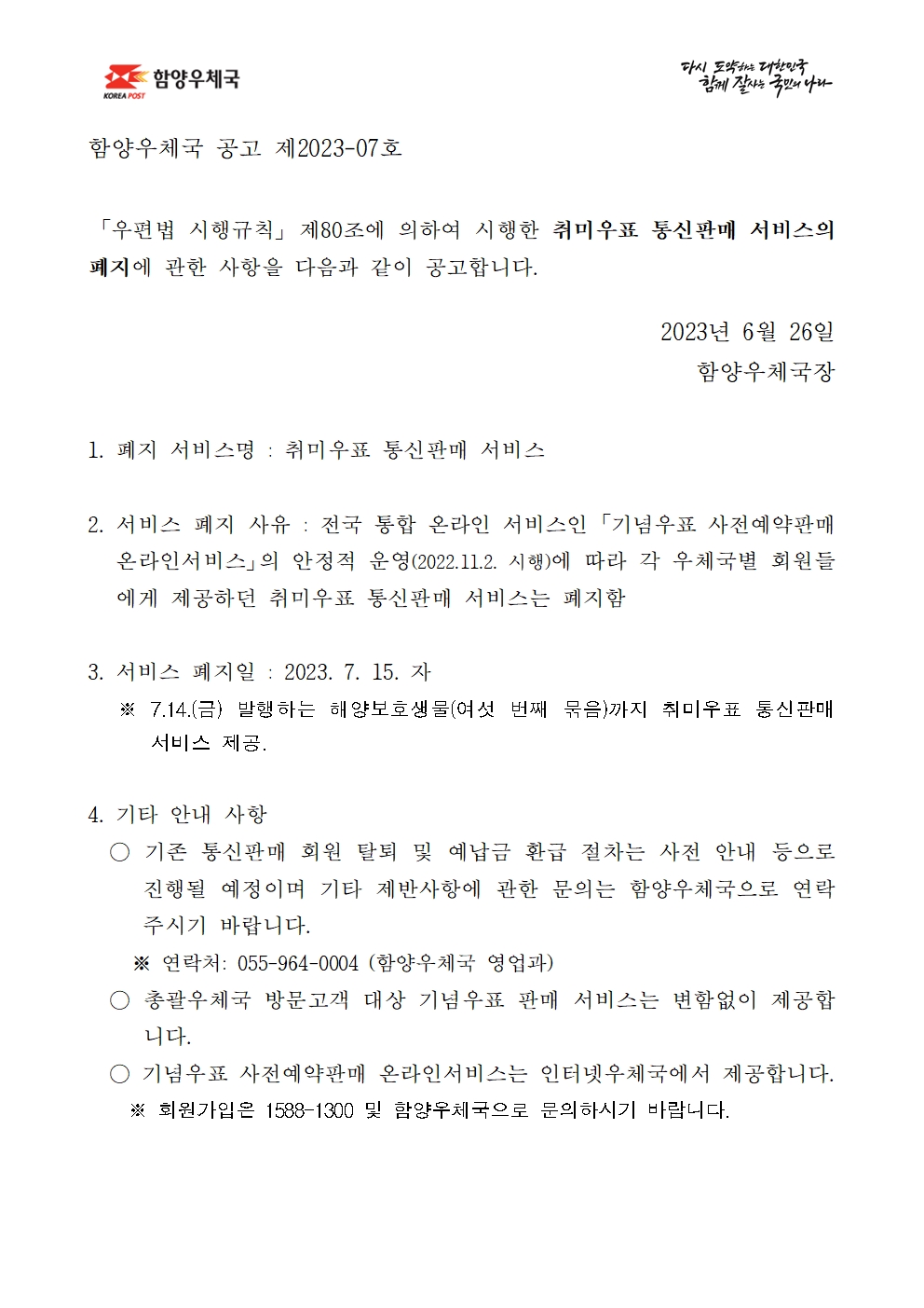함양우체국 취미우표 통신판매 서비스 폐지 안내