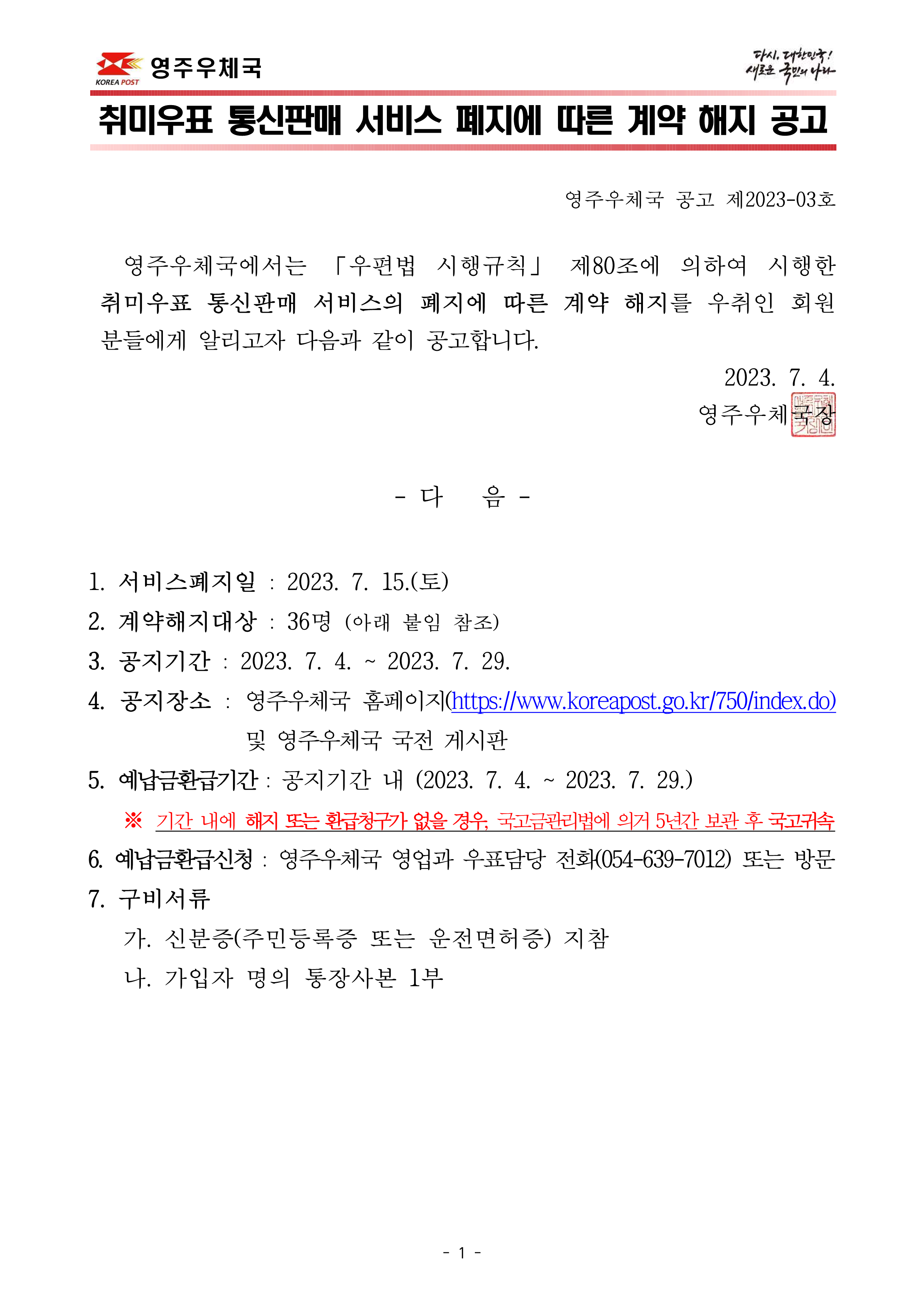 영주우체국 취미우표 통신판매 서비스 폐지에 따른 계약 해지 공고