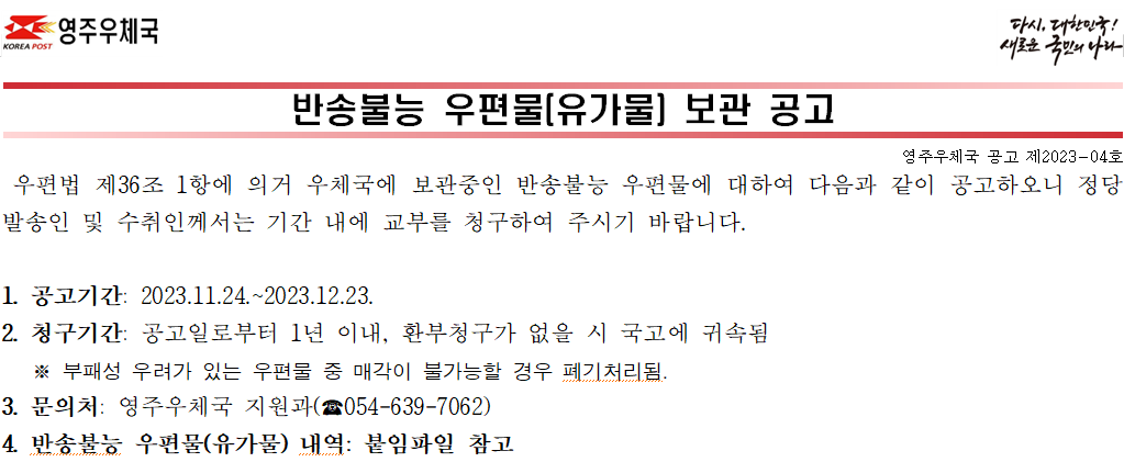 영주우체국 반송불능 우편물 보관 공고