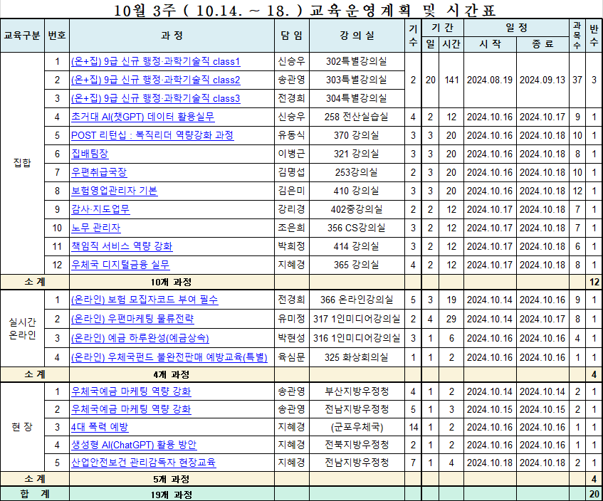 10월 3주 ( 10.14. ~ 18. ) 교육운영계획 및 시간표