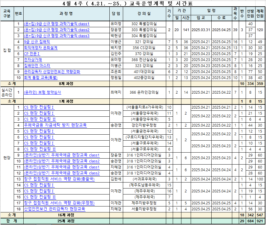 2025.4.21.(월)~4.25.(금) 교육시간표입니다.