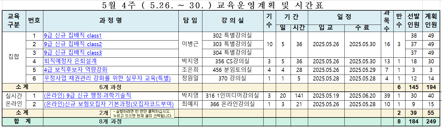5월 4주 ( 5.26. ~ 30. ) 교육운영계획 및 시간표