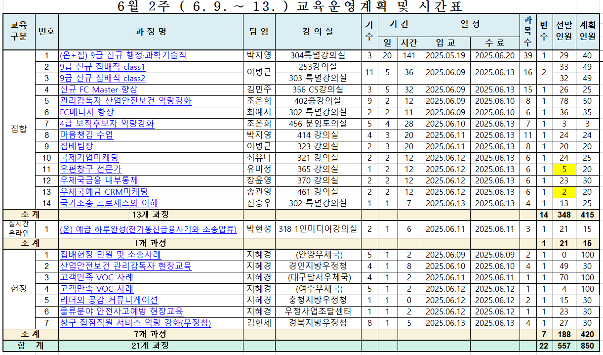 6월 2주 ( 6. 9. ~ 13. ) 교육운영계획 및 시간표