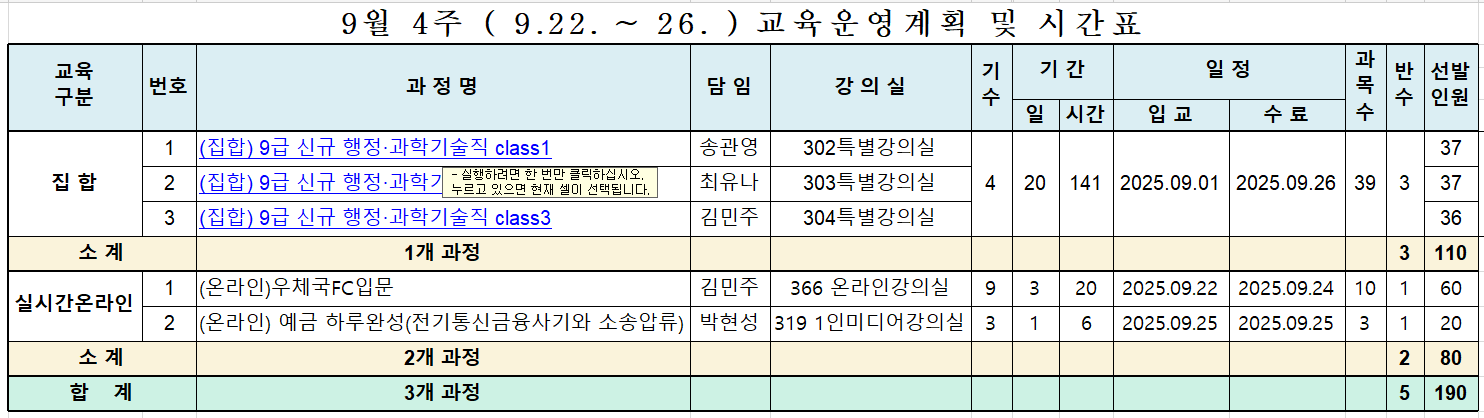 9월 4주 ( 9.22. ~ 26. ) 교육운영계획 및 시간표